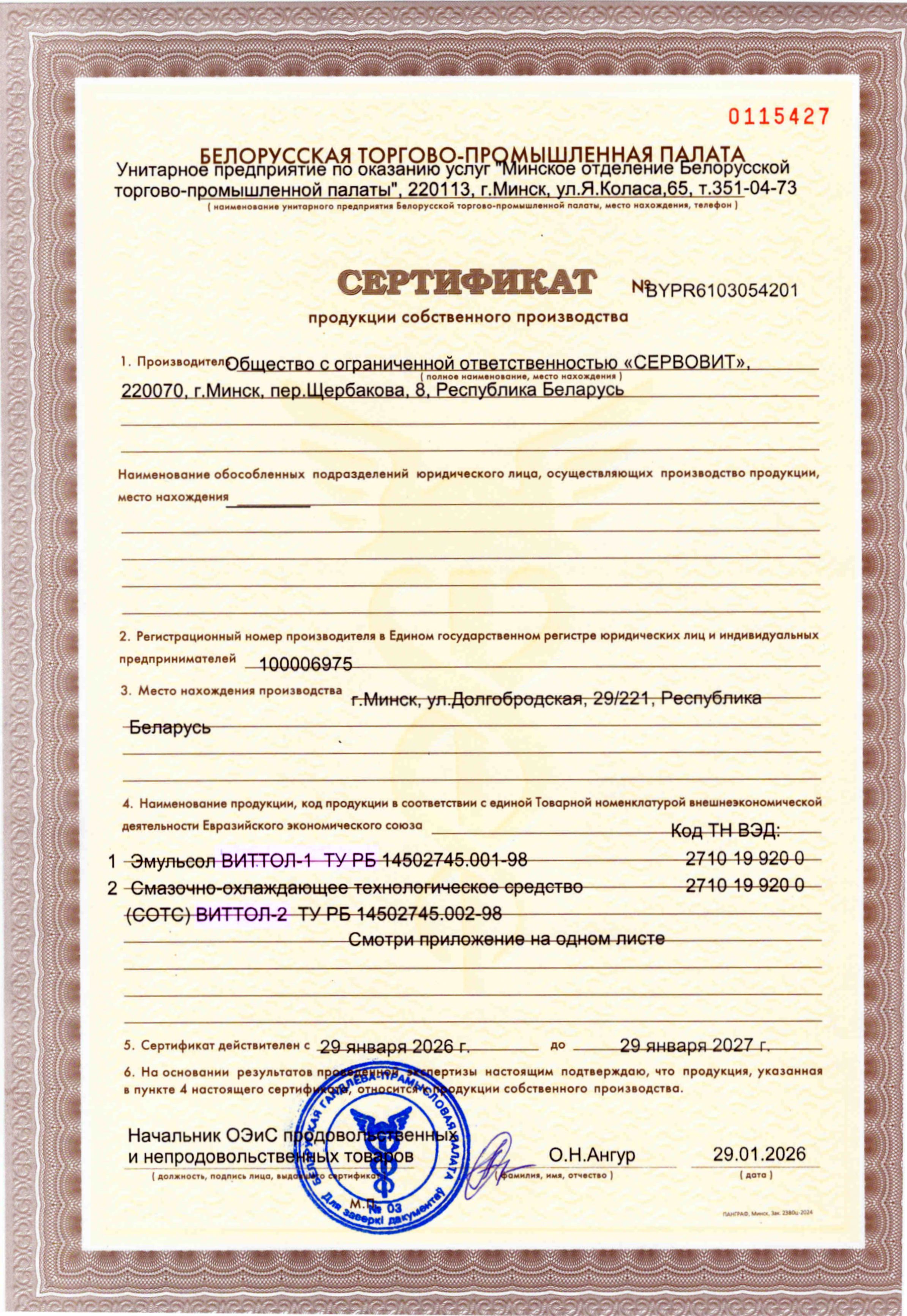 Продукция ООО «СЕРВОВИТ» выпускается под торговой маркой «ВИТТОЛ», свидетельство о регистрации №1204 выдано 1999 году Государственным патентным комитетом Республики Беларусь.