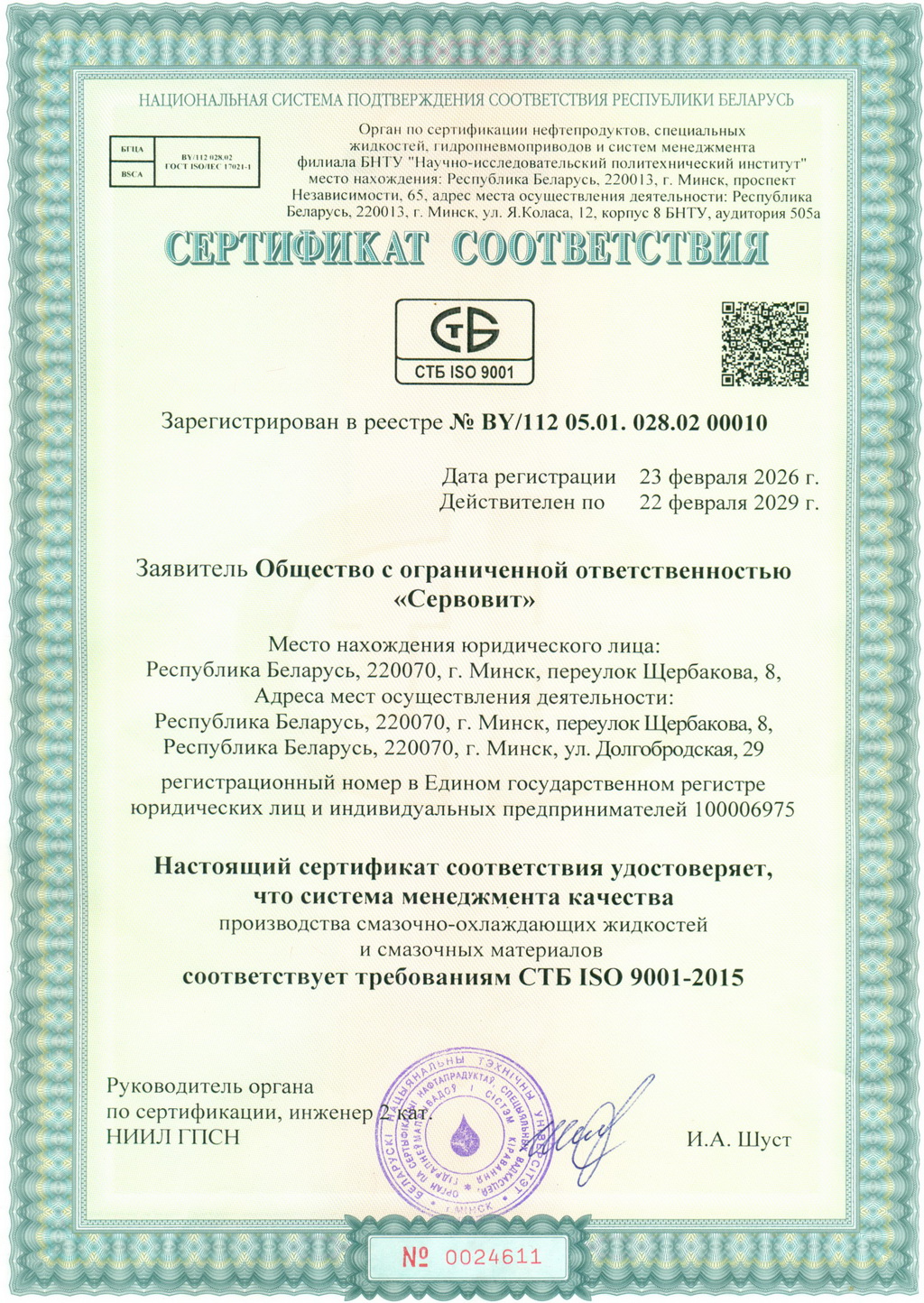 ООО «СЕРВОВИТ» — современное предприятие по разработке, производству смазочно-охлаждающих жидкостей и оборудования для их приготовления. Фирма образована в городе Минске 11 февраля 1992 года. В 1996 году мы награждены золотой медалью Всероссийского выстовочного центра за создание высокоэффективных технологий получения СОЖ.